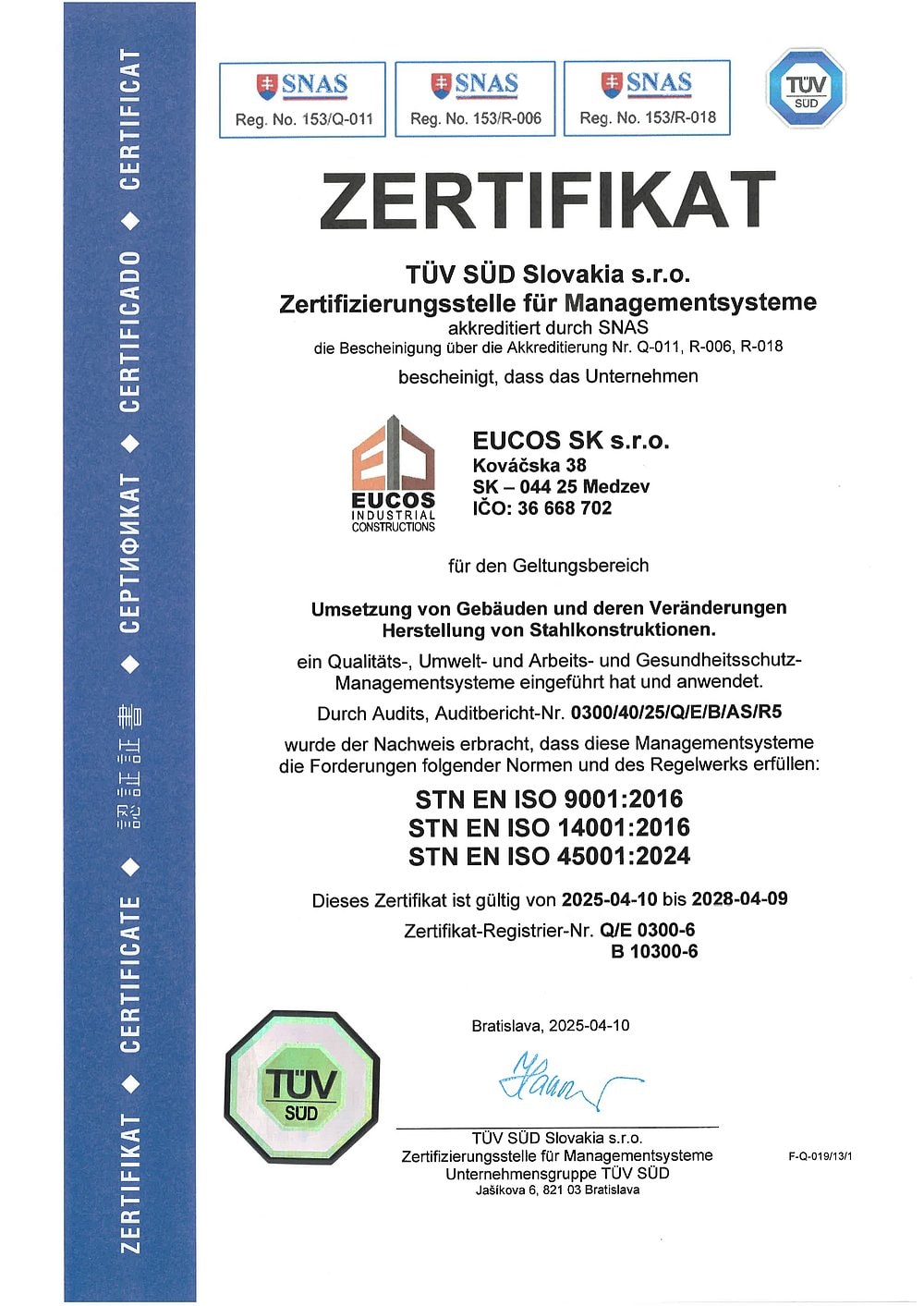 Mit dem Besitz des EMAS-Zertifikats bestätigen wir, dass wir bei der Herstellung von Stahlkonstruktionen sowie bei der Umsetzung von Bauwerken strenge Qualitäts- und Sicherheitsstandards mit Respekt gegenüber der Umwelt und den lokalen Gemeinschaften verbinden.