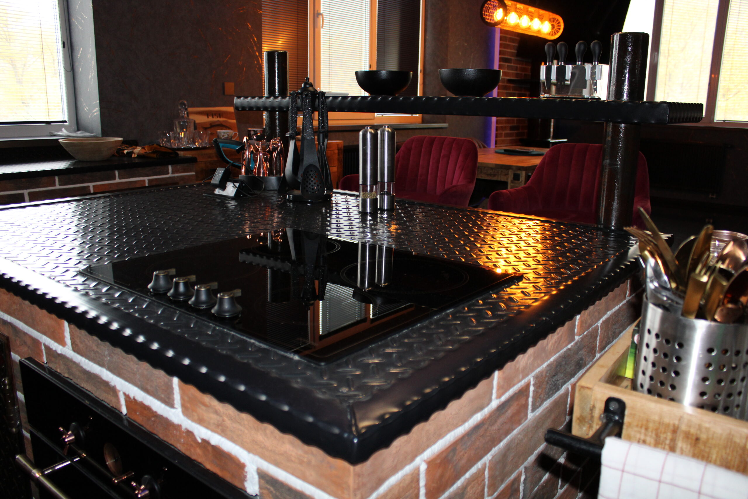 Nádherná industriálna kuchyňa s netradičnými prvkami. Kuchynské dvierka zo slzičkového plechu, úchytky z ventilov a mnoho iných prvkov.